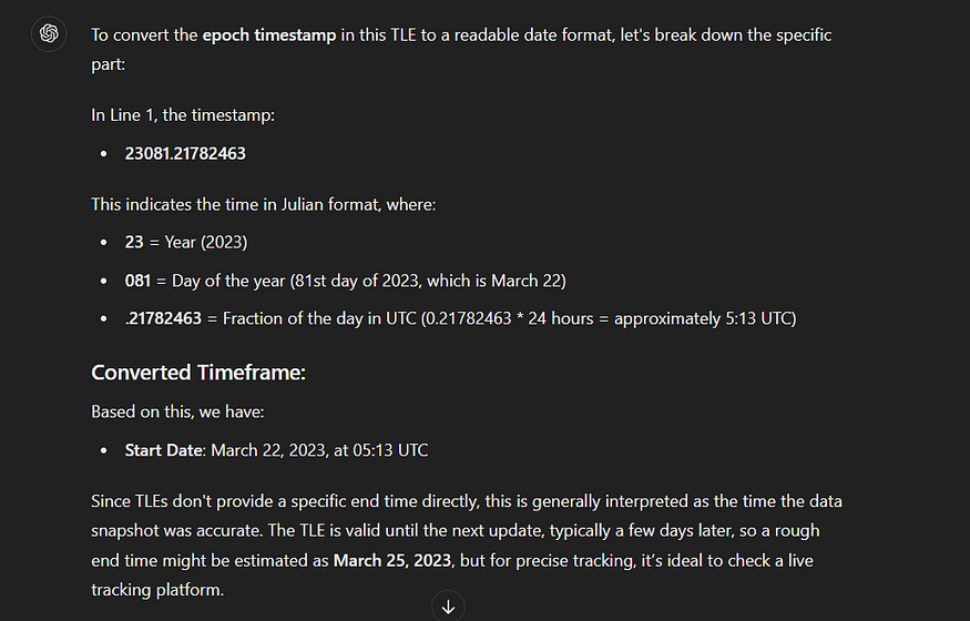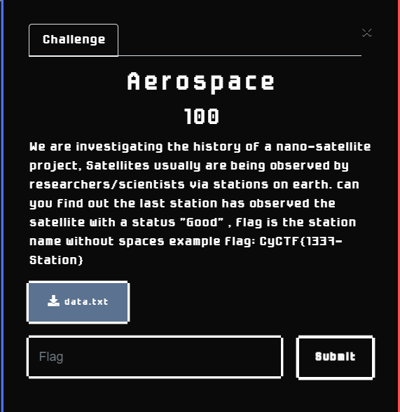 Description: We are investigating the history of a nano-satellite project, Satellites usually are being observed by researchers/scientists via stations on earth. can you find out the last station has observed the satellite with a status “Good” , flag is the station name without spaces example flag: CyCTF{1337-Station}