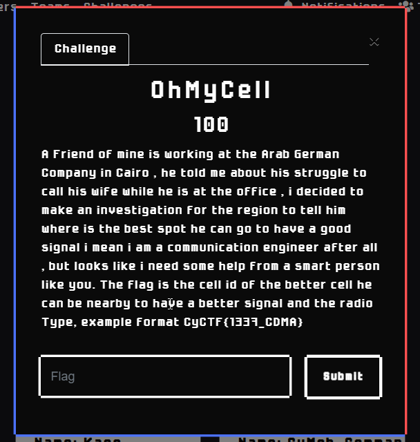 Description: A Friend of mine is working at the Arab German Company in Cairo , he told me about his struggle to call his wife while he is at the office , i decided to make an investigation for the region to tell him where is the best spot he can go to have a good signal i mean i am a communication engineer after all , but looks like i need some help from a smart person like you. The flag is the cell id of the better cell he can be nearby to have a better signal and the radio Type, example format CyCTF{1337_CDMA}