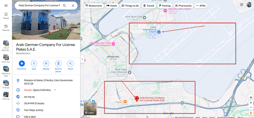 but the one that fits with the description is the “Arab German Company For License Plates S.A.E.” Since it’s near the Airport that answers the Struggle in phone calls and now it makes sense unlike the others