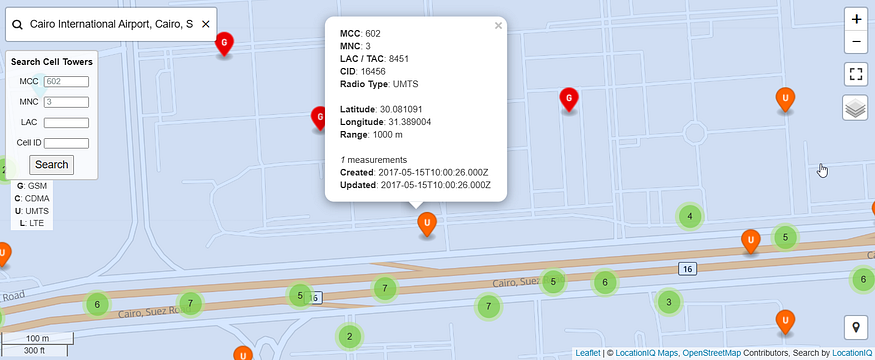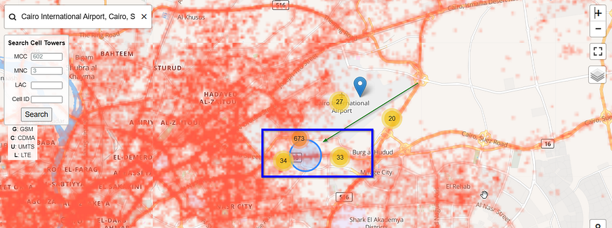 Using this info in OpenCelliD and locating the same place in its map and simulating the exact place (in front of Cairo AirPort) we reached: