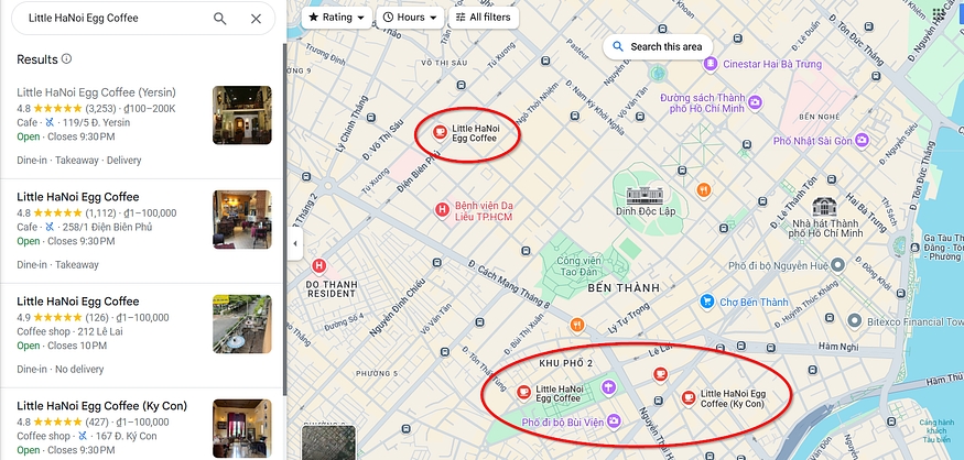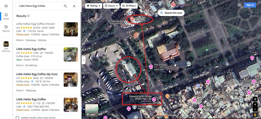 Searching Google Maps for little hanoi egg coffee